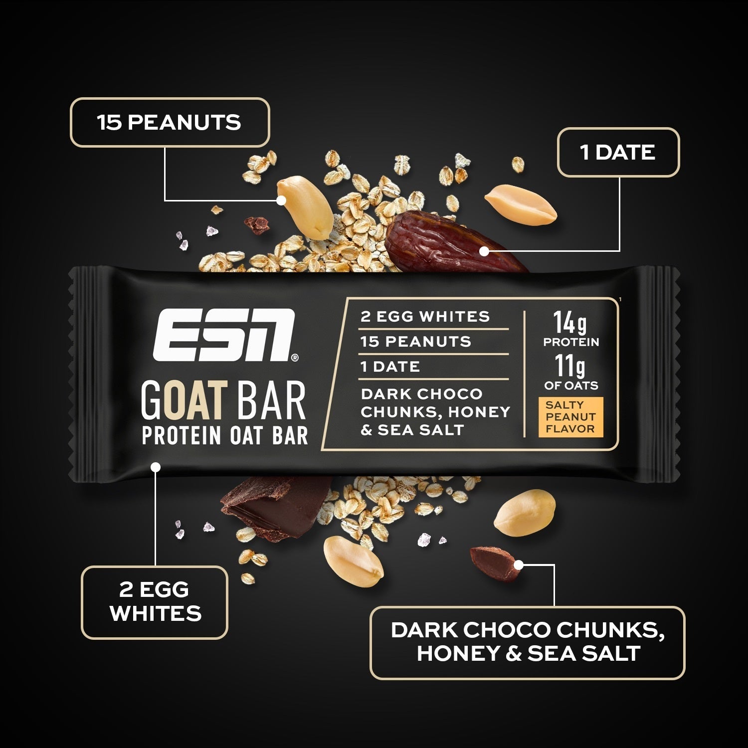 Natürlich stark – mit der idealen Balance aus Oats, Protein & Ballaststoffen. Unser GOAT Bar liefert dir echte Zutaten, 14 g hochwertiges Eiklar-Protein, vollwertige Energie aus Hafer, Nüssen und Früchten – keine Füllstoffe, natürlich gesüßt mit Datteln & Honig.Mit dieser idealen Balance aus hochwertigem Protein als Muskel-Support, komplexen Kohlenhydraten, Ballaststoffen, gesunden Fetten und Mikronährstoffen ist er dein perfekter Snack für Alltag, Job oder Training.1,2 Mit natürlichen Zutaten für echten Geschmack.