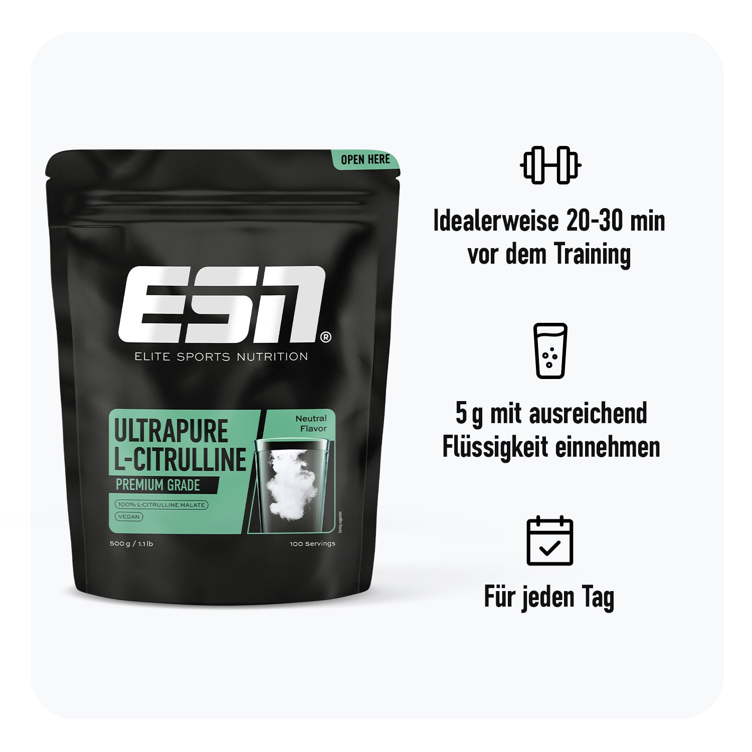Unser mikrofeines Ultrapure L-Citrulline Pulver enthält 100 % L-Citrullin Malat in höchster Qualität und mit optimaler Bioverfügbarkeit. L-Citrullin Malat ist eine Kombi aus der Aminosäure L-Citrullin und Malat (Apfelsäure). Die Aminosäure L-Citrullin wird im Körper in L-Arginin umgewandelt, das wiederum die Produktion von Stickstoffmonoxid (NO) fördert. NO kann die Blutgefäße erweitern, den Blutfluss verbessern und so die Nährstoff- und Sauerstoffversorgung deiner Muskeln supporten. Das Ergebnis: maximaler Pump und erhöhte Ausdauer während des Workouts. Einer Studie zufolge konnte Citrullin Malat bspw. die aerobe Leistung bei Ausdauersportlern steigern. 3 Die Teilnehmer konnten also längere Trainingseinheiten mit höherer Intensität absolvieren. 3