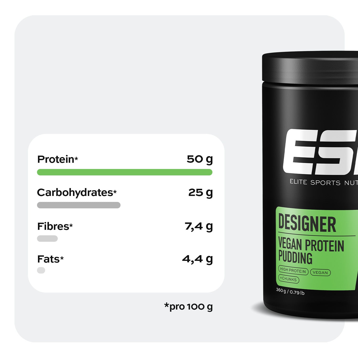 High protein, high flavour, hi vegan: Designer Vegan Protein Pudding. Our irresistibly creamy protein pudding is now also available in a vegan version. With 16 g of protein per portion, you can easily support your muscles in building and maintaining them while enjoying the creamiest vegan pudding with real chunks!