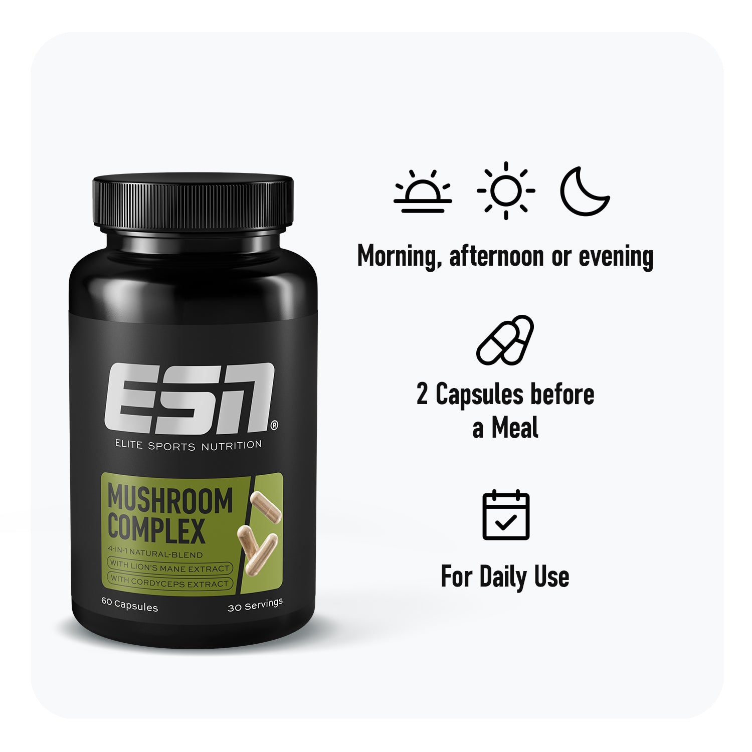 Biohacking de nouvelle génération – avec notre Mushroom Complex. Le complexe de champignons 4-en-1 à haute dose, composé des extraits de champignons Lion’s Mane, Cordyceps, Reishi et Chaga, vous aide à trouver votre flow intérieur.